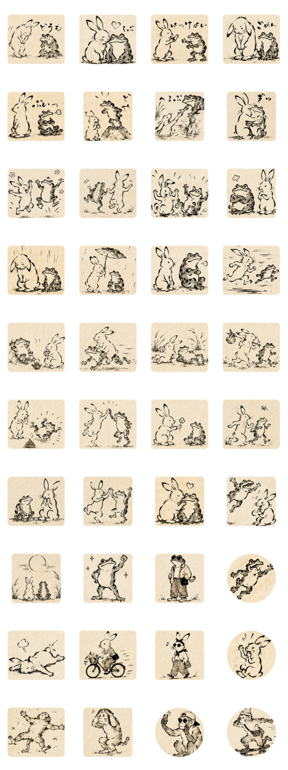 | スタンプ説明 | 鳥獣戯画風のうさぎとかえる、たまに猿。墨江タッチ、和風でちょっとシュールなゆるい日常スタンプです。 |