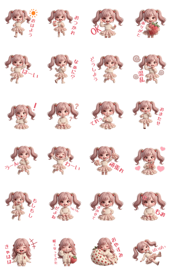 | スタンプ説明 | 3Dのぷにぷに質感がかわいいパステル系いちご女子の日常スタンプです。恋人/カップル/友達/家族/挨拶/リアクション/女の子/くすみカラー/パステルピンク/ツインテール |