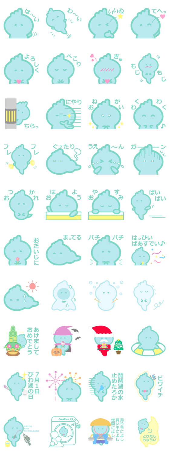 | スタンプ説明 | 琵琶湖のかわいいキャラクターFairy♥BIWA(フェアリービワ)のスタンプです。 日常で使えるコトバと滋賀ならではのコトバでトークを楽しんでね♪ |