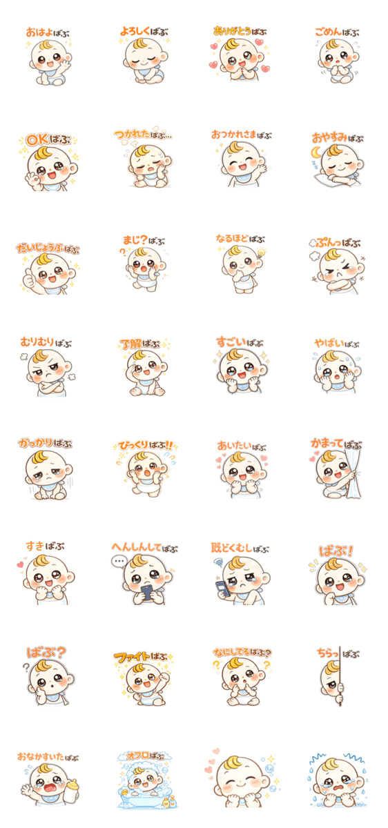 | スタンプ説明 | 毎日のトークで使いやすい、かわいくて便利な「ばぶ」のスタンプです。 あいさつ・リアクション・気持ちを、やさしくかわいく伝えられます。 |