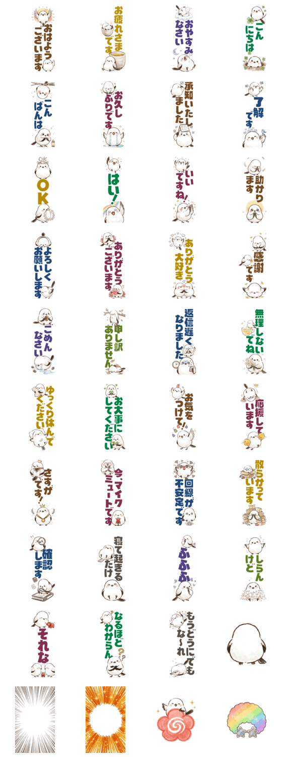 | スタンプ説明 | 大きな文字の敬語で毎日の挨拶に。左の余白にスタンプやエフェクトを重ねてアレンジできる大人の癒やし系スタンプです。 ※このスタンプはトークルームで大きく表示されるBIGスタンプです。 |