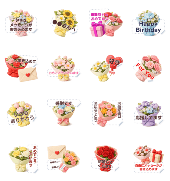| スタンプ説明 | お誕生日や記念日のお祝いに♡フロッキー質感がポップでゆる可愛い花束・プレゼント・ラブレターのメッセージスタンプ♪バラやカーネーションで母の日やプロポーズにも♪ 現在この商品は一部のスマートフォン版LINE 10.3.0以上のトークルームでのみ使用できます。動作環境の最新情報はヘルプをご確認ください。 |