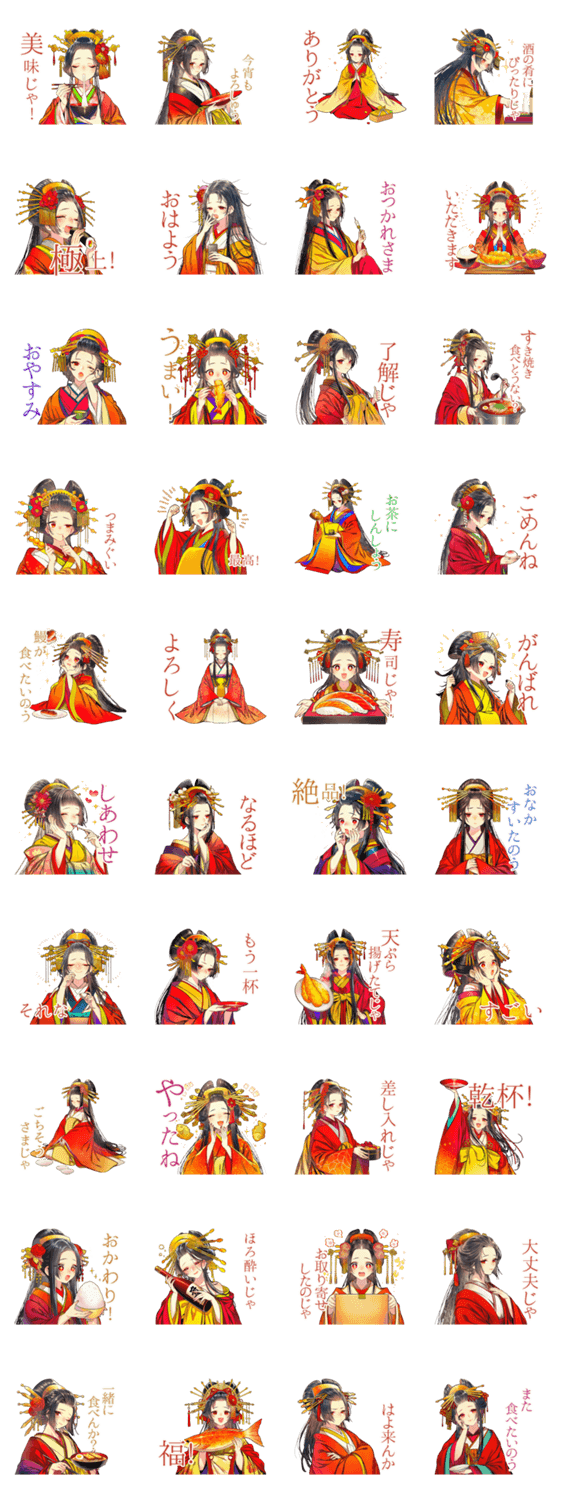 | スタンプ説明 | 花魁が料亭グルメをお取り寄せ!和風美人のかわいいスタンプ/挨拶/日常/毎日使える/着物/癒し/美麗/大人/女子/グルメ/萌え/食べ物/料理/シンプル/嬢/水商売 |
