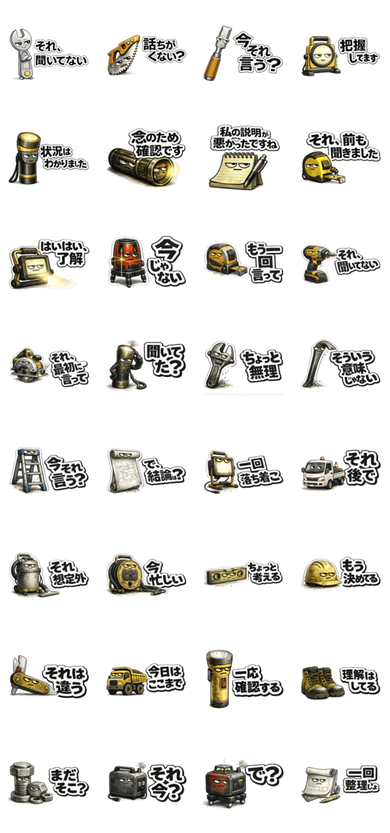 | スタンプ説明 | ちょっと塩、でも使いやすい。 工具たちがあなたの代わりに本音をポロリ。 職場でも日常でも使える、静かに刺さるスタンプ集。 |
