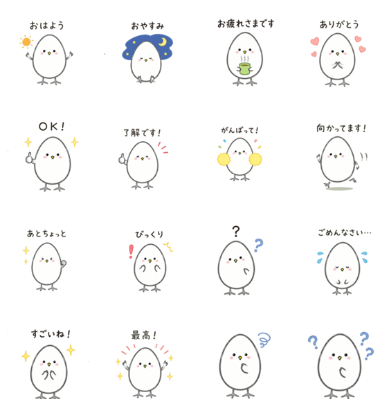 | スタンプ説明 | やさしくてちょっとゆるい、たまごみたいなひよこの日常スタンプ。 おはよう・おやすみ・ありがとうなど、毎日の会話にそっと寄り添います。 |