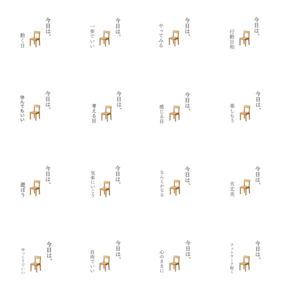 | スタンプ説明 | This refined version of the Today series features minimalist chair designs with simple, thoughtful words. |