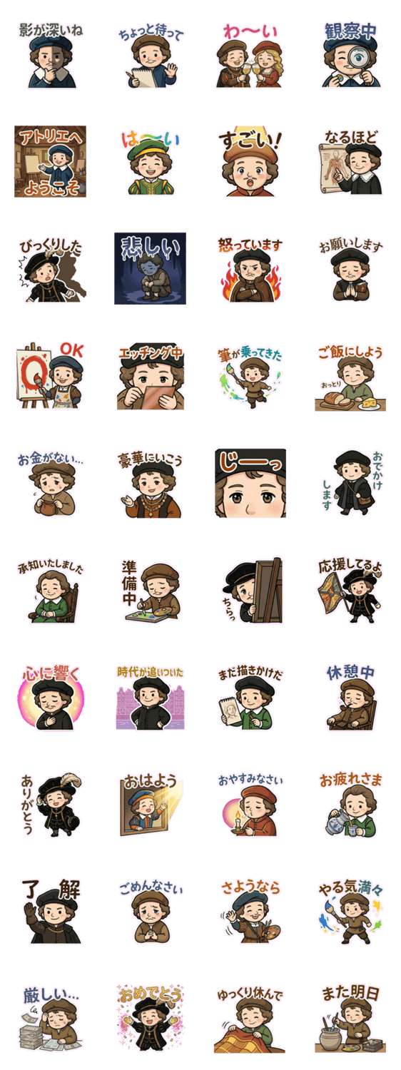 | スタンプ説明 | 光と影の魔術師レンブラントがゆるかわキャラに!自画像や『夜警』などの名作をモチーフにしたスタンプが、日々のトークを芸術的かつ穏やかに彩ります。 |