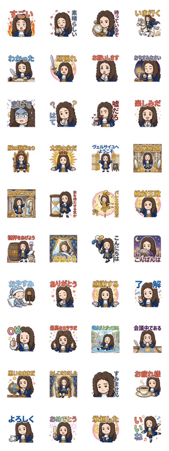 | スタンプ説明 | 太陽王・ルイ14世がゆるかわに!「朕は国家なり」などの名言や、豪華な宮廷生活をイメージしたスタンプで、あなたのトークを華やかに演出します。 |