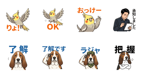 | スタンプ説明 | 「了解」「OK」「承知」など返事だけの8スタンプ。 仕事・日常・友達とのやり取りにすぐ使えて便利! |