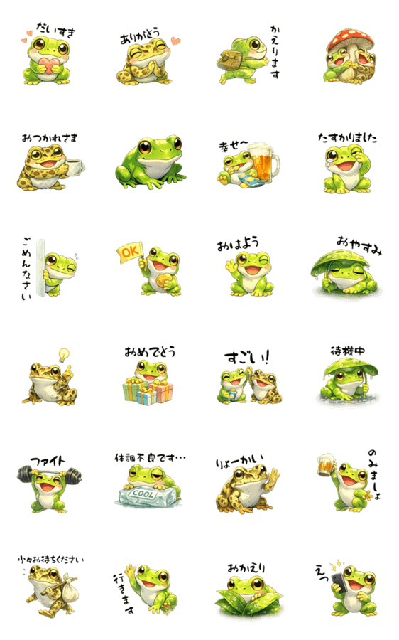 | スタンプ説明 | カエルの可愛いスタンプ。日常で使えそうな言葉で作成しました。カエル好きの方にどうぞ。 |