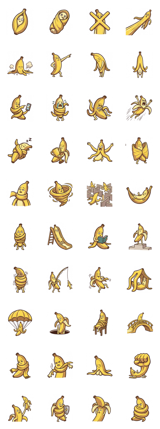 | スタンプ説明 | 自由自在に伸びる皮で気持ちを伝えるバナナ。日常の返信やリアクションを、文字を使わずシュールな構図で表現します。意味深な匂わせ表現をしたいあなたに。 |