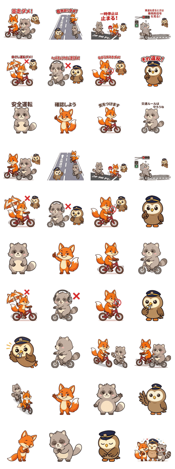 | スタンプ説明 | キツネ,タヌキ,フクロウで伝える自転車青切符ルールスタンプ。並走、右側通行、ながらスマホ、一時停止など、気をつけたい交通ルールをかわいく分かりやすくまとめました。 |