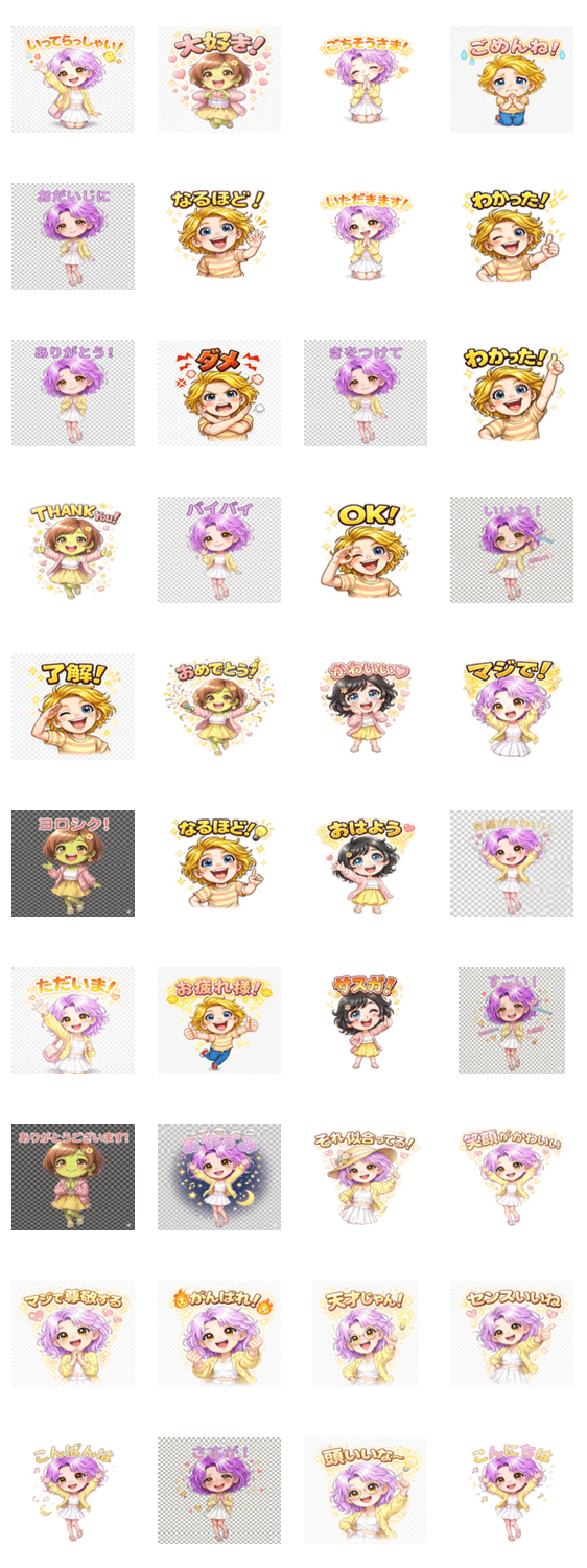 | スタンプ説明 | 女性をモチーフにした陽気で楽しいスタンプです。挨拶や返信に使いやすい40枚のセットです。 |