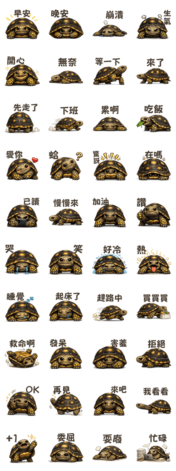 | スタンプ説明 | Take it slow, it is okay. A yellow-footed tortoise lives life at its own pace. From lazy moments to daily struggles, move forward step by step. |