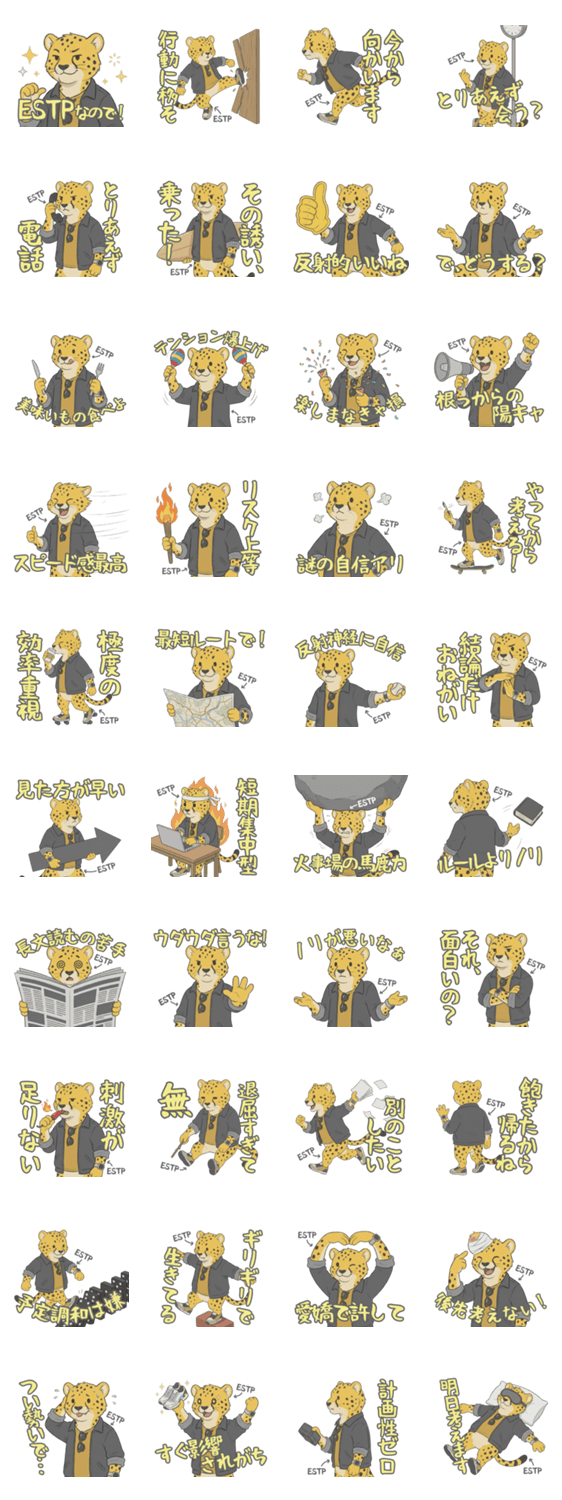 | スタンプ説明 | 鋭い観察眼と行動力で挑戦するESTPのためのスタンプ。考えるより先に動き出し、チャンスを掴むエネルギーを表現。勢いのあるセリフでテンポよく返信したい時に活躍します。 |
