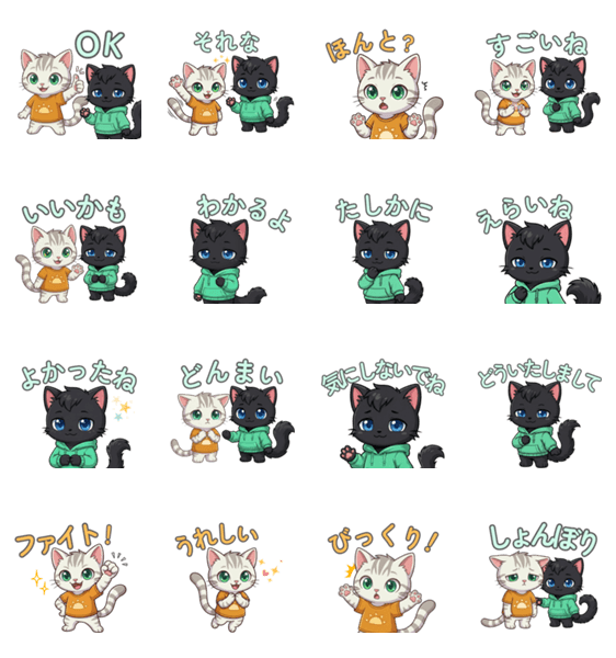 | スタンプ説明 | やさしい黒猫ノクトと、元気な猫ルクスのリアクションスタンプです。 返事や共感、気持ちを伝えやすい言葉をまとめました。 日常会話にどうぞ。 |