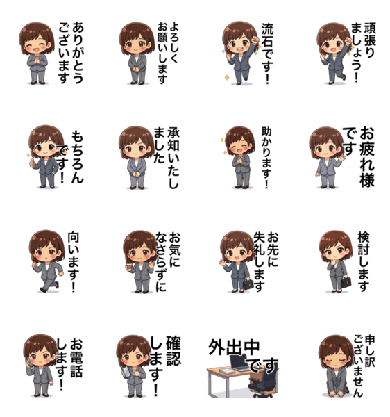 | スタンプ説明 | ビジネスシーンで大活躍!スーツ女子のスタンプです。 ・使いやすい敬語が満載 ・誠実さが伝わる豊かな表情 仕事仲間とのコミュニケーションを、もっと円滑に楽しく! |