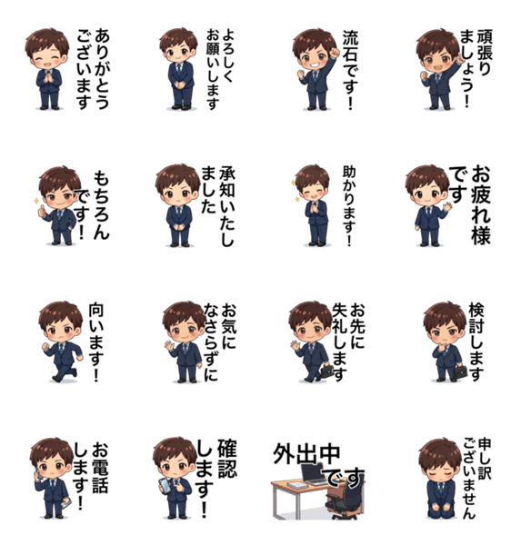 | スタンプ説明 | ビジネスシーンで大活躍!スーツ男子のスタンプです。 ・使いやすい敬語が満載 ・誠実さが伝わる豊かな表情 仕事仲間とのコミュニケーションを、もっと円滑に楽しく! |