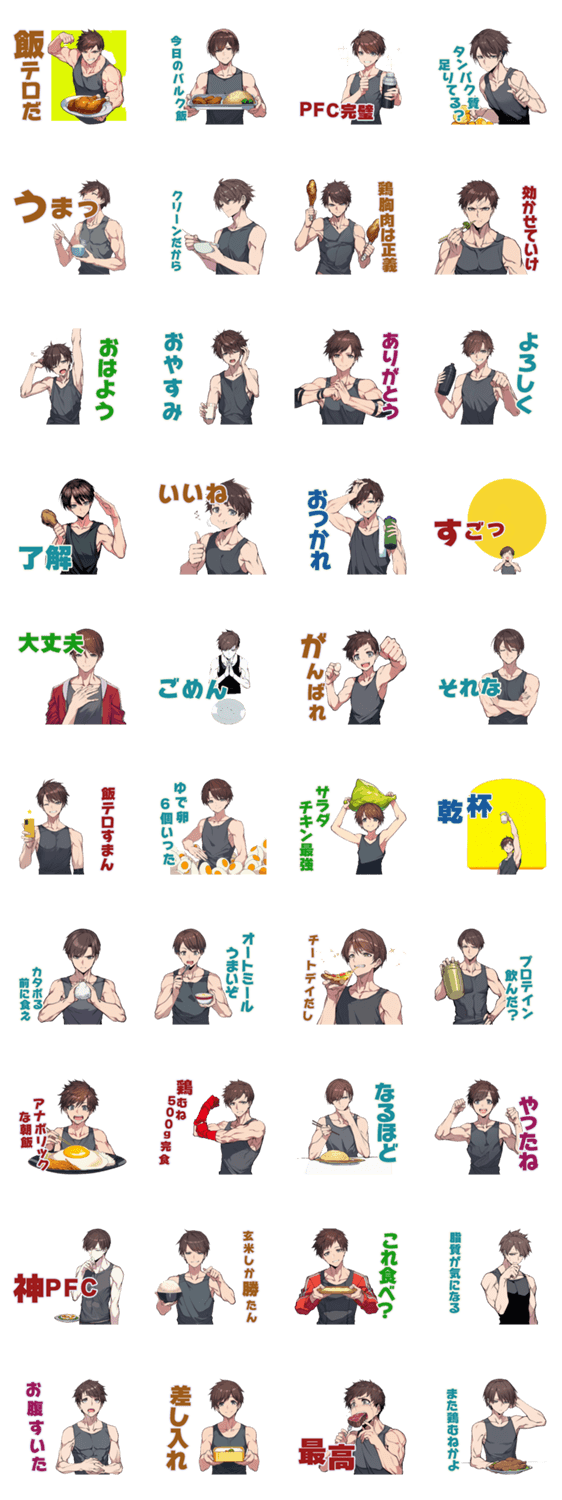 | スタンプ説明 | 筋トレ好きにオススメ!高タンパクな飯テロスタンプ/筋肉/マッチョ/プロテイン/ジム/男子/日常/挨拶/応援/ポジティブ/大人/社会人/癒し/毎日使える/ゆるい |