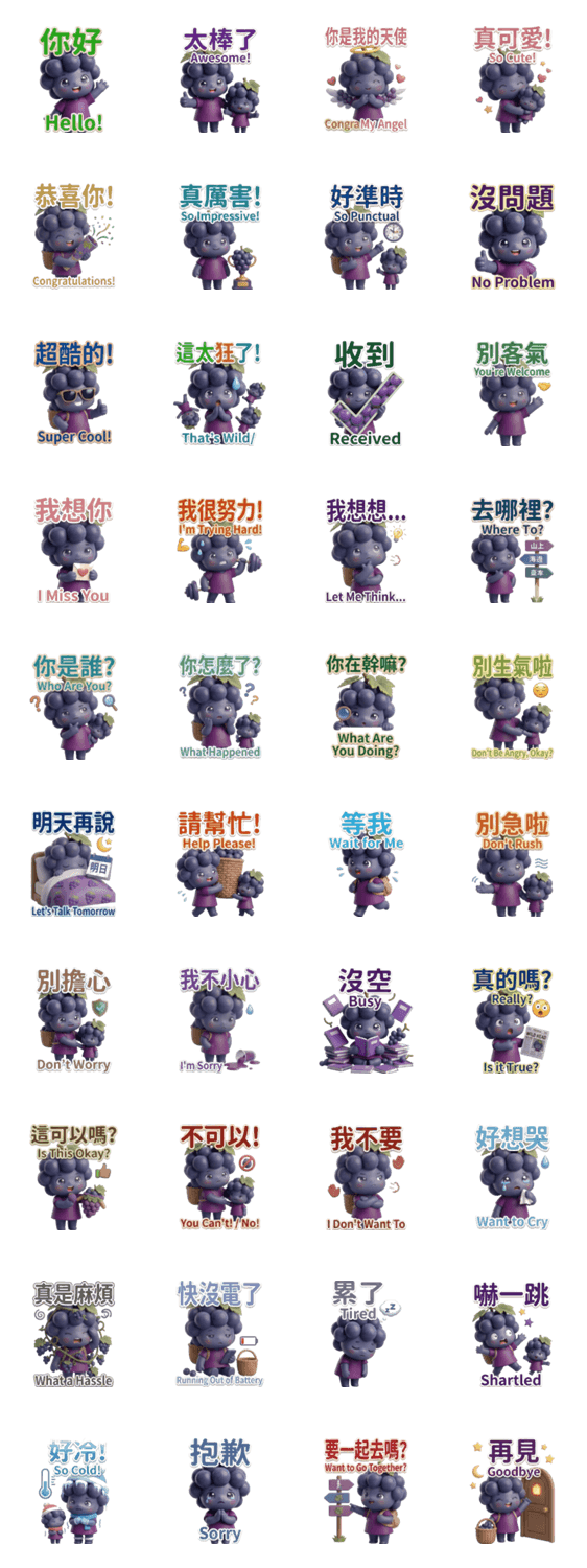 | スタンプ説明 | A cute grape character for everyday questions and chats! Perfect for friends, family, and coworkers. |
