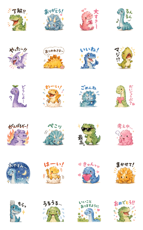 水彩タッチのゆるかわいい恐竜たちが毎日の会話を彩ります。 あいさつ、お礼、応援など、日常で使いやすい24種類をお届け。 個性豊かな恐竜たちをお楽しみください。