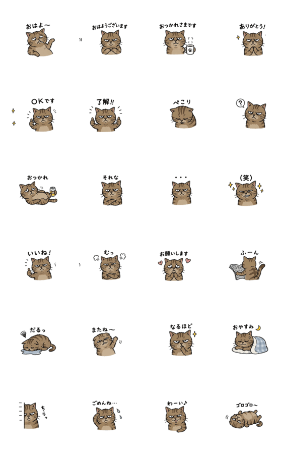 不機嫌そうなのにかわいい、ぶすかわ猫のスタンプ。日常のあいさつや気持ちを表現できます。