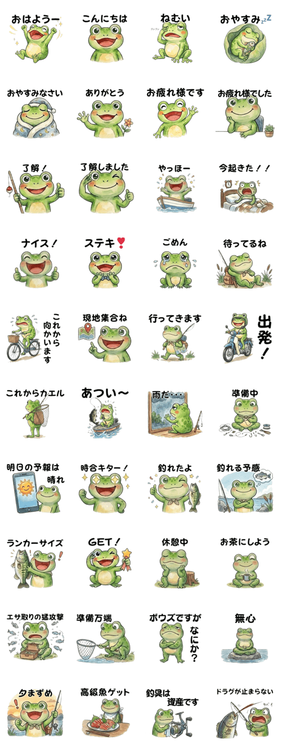 | スタンプ説明 | 釣りとお出かけが大好きなカエルのスタンプです。釣りの誘いや準備、日常の挨拶まで、釣り人ならあるある!なシーンを水彩風の優しいタッチで描きました。 |