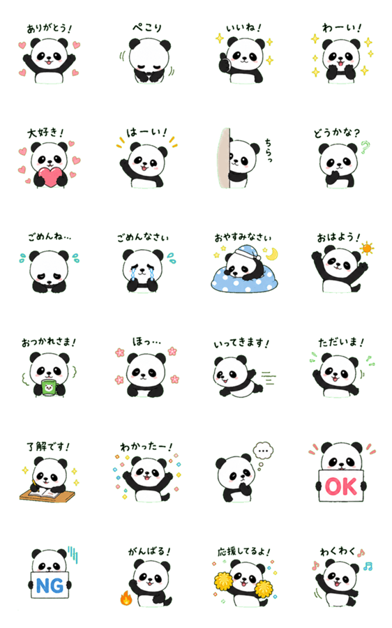 にこにこパンダキャラ「パンダちゃん」の日常スタンプ24枚。挨拶・感謝・共感など毎日のトークで使えるひとことを厳選。家族・友人・職場でほっこり気持ちが伝わります。