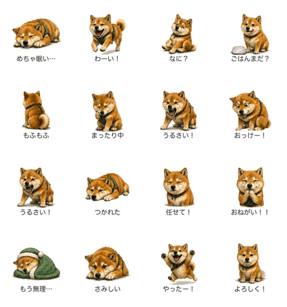 もちもち柴犬の日常スタンプ。眠い・疲れた・うれしいなど気持ちを全16種で表現!