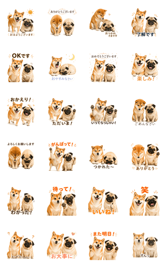 元気な柴犬とのんびりパグの仲良しコンビ。日常のあいさつや気持ちを伝えるスタンプです。