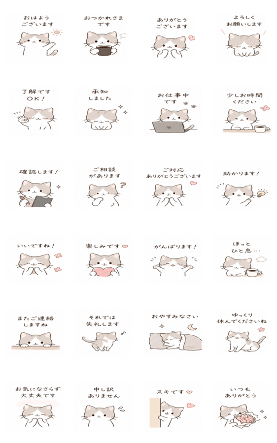 かわいいねこが丁寧な言葉を届けます。仕事もプライベートも使える敬語フレーズ24種。上司・同僚・取引先にも使いやすい。癒されながら好印象を与えたい社会人に届け。