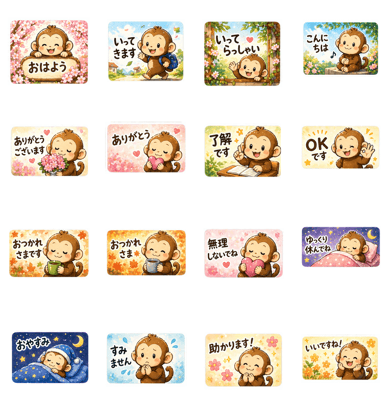 大人が使いやすいお猿スタンプ。仕事や保護者LINEでも使いやすく、毎日の会話に寄り添います。おはよう、ありがとう、おつかれさまなど日常で使える言葉をそろえました。