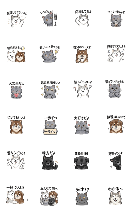 | スタンプ説明 | Adorable cats, dogs, and a cheerful character to brighten your day! Perfect for warm encouragement and daily greetings. |