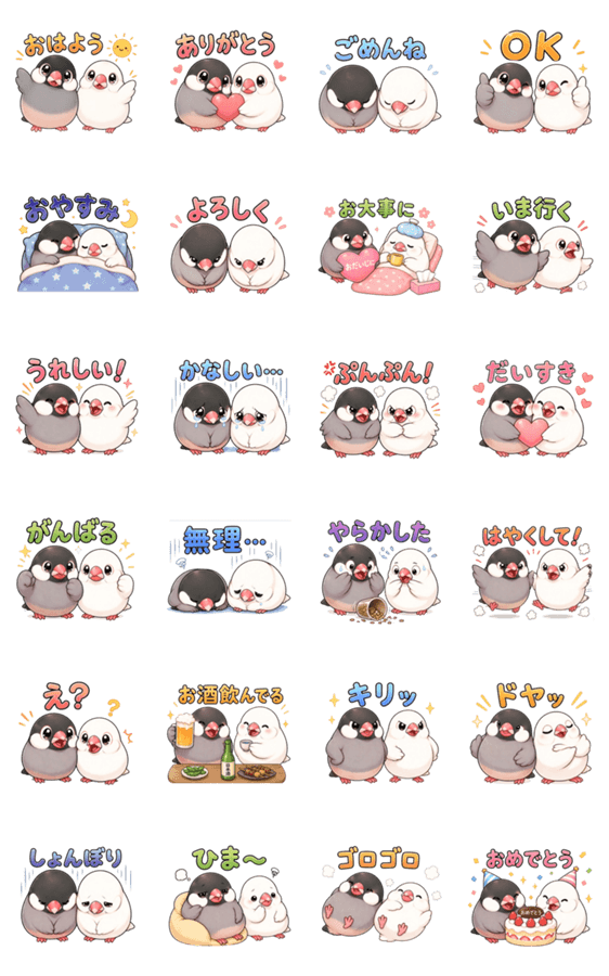 かわいいもちもち文鳥のスタンプです。 日常会話で使いやすいあいさつやリアクションをたくさん収録しています。「ありがとう」など気持ちをやさしく伝えられます