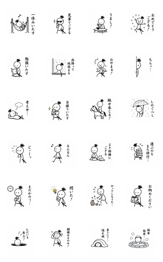 | スタンプ説明 | Cute and lovable Yuru Samurai daily stickers 24 designs. Short phrases for greetings thanks and chats. Share warm feelings with family friends and coworkers. |