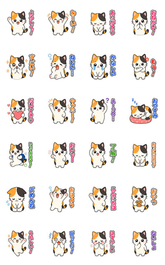 かわいい三毛猫「みけ」の日常スタンプです。あいさつ・感謝・喜び・怒りなど気持ちを表す24種類。毎日のトークをもっと楽しく彩ります♪