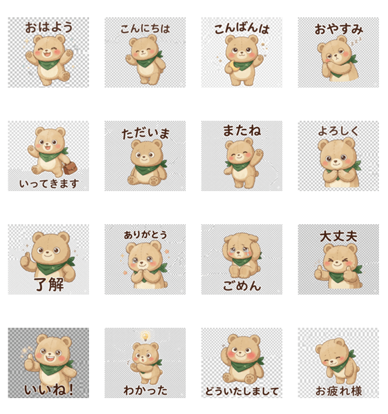 緑のクローバーバンダナがトレードマークのゆるかわくま。あいさつから返事・連絡まで日常会話で使いやすい16種類を収録。友だちや家族とのトークにぜひ!