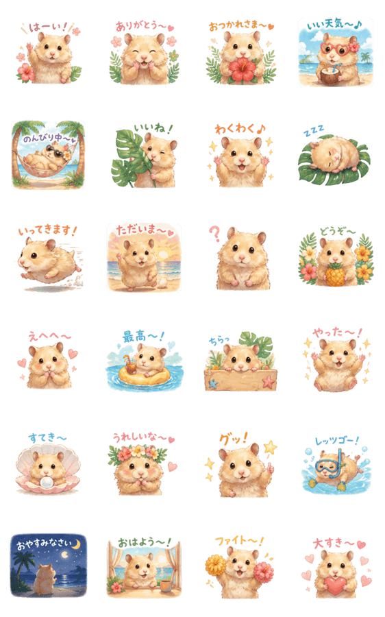 毛長ゴールデンハムスター「ふくまる」が南国でのんびり♪ あいさつや気持ちを伝える24種のかわいいスタンプ。ふわふわの癒しを毎日のトークにお届けします