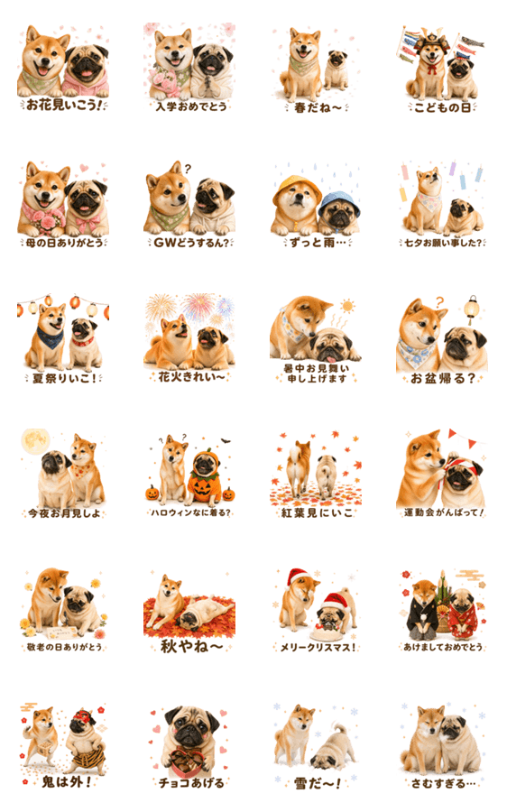 柴犬とパグのコンビが季節のイベントを一緒に楽しむスタンプです。お花見からクリスマスまで、1年中使えます!