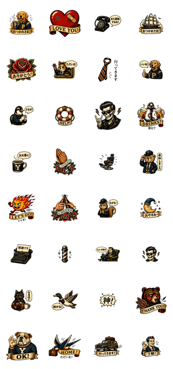 太い線と存在感のあるデザインが特徴のアメリカントラディショナル風スタンプ。日常会話やリアクションをスタイリッシュに彩ります。