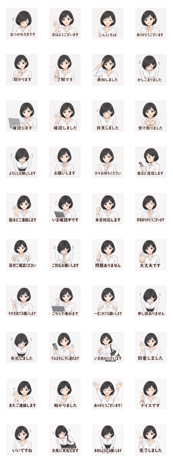 職場で使えるゆる敬語スタンプ40種。あいさつ・返信・確認・謝罪・感謝・連絡など、毎日のチャットの定番フレーズを網羅。