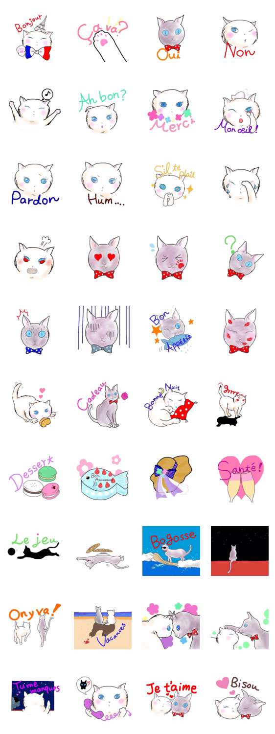| スタンプ説明 | It's for people who like France or french.My desire was to draw and imagine cats in Paris who express everyday feelings.These are useful French idioms! |