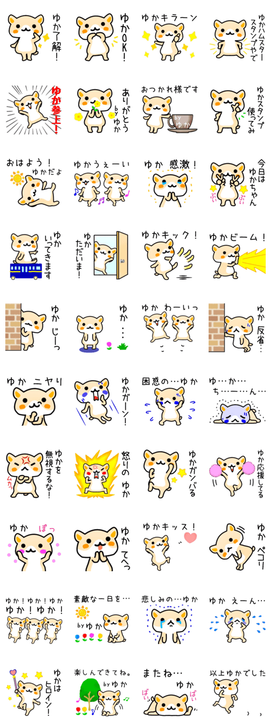 ハムスターのユカさんスタンプです。ゆかさん以外の方も使えます。 由佳さん、結花さん、まだまだ沢山のゆかさん、是非 使ってみて下さい。よろしくお願いします。