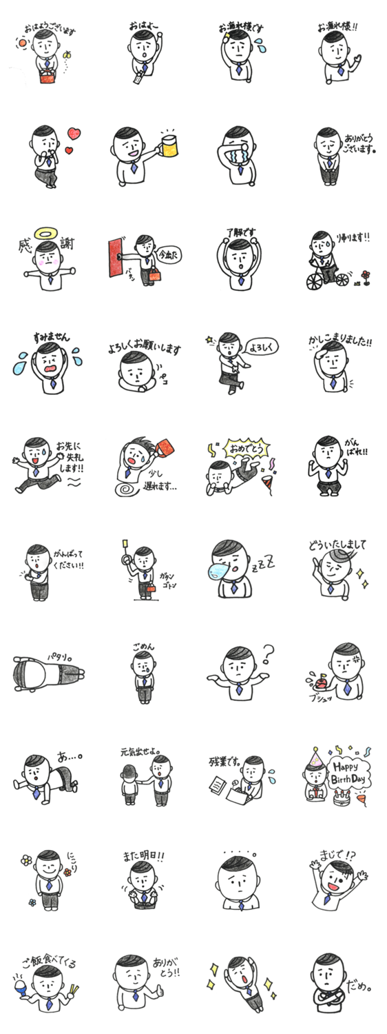 | スタンプ説明 | このスタンプは困り眉毛のサラリーマンの日常を描いています。働いている方の日常会話に使っていただければうれしいです。お父さんや会社の仲間にプレゼントしてもどうぞ。 |