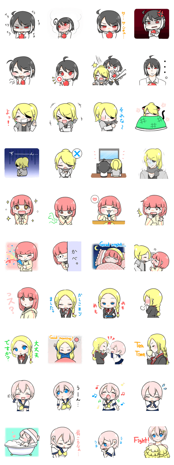 ツンデレ男子のラウ、元気男子のリシン、かわいい系男子のクロル、紳士男子のアシュレイ、ほわほわ女子の桃香のスタンプ。個性豊かな5人がトークをお手伝いします。