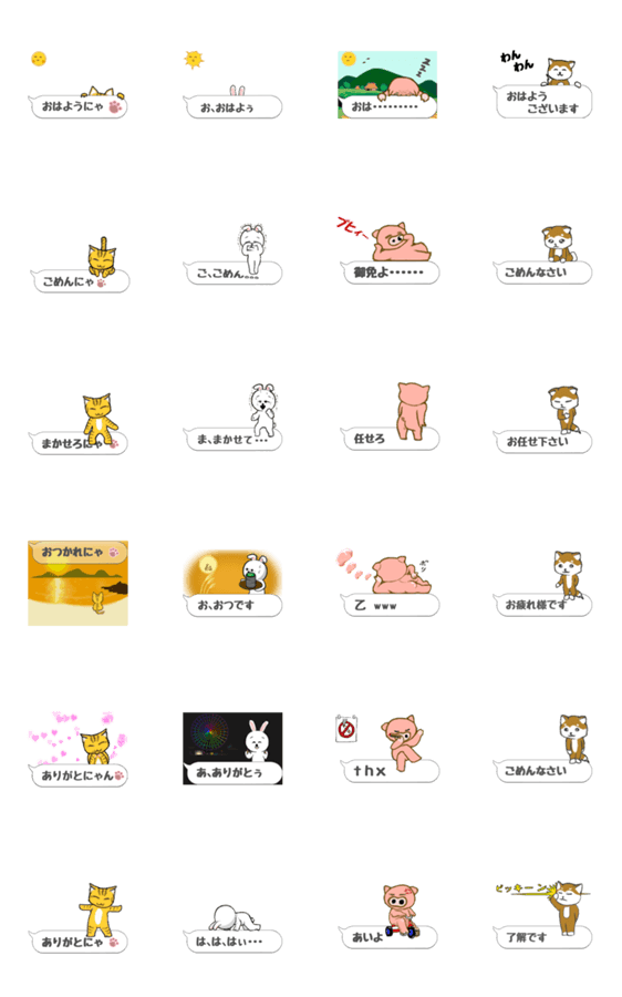 4匹の動物達がそれぞれの言葉で返します。 「時」や「相手」によって使い分けが可能です。