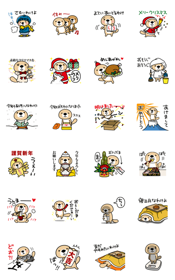 あなたに代わってストレートに気持ちを伝えるラッコさんのアニメーションスタンプ第二弾。クリスマスやお正月、年末年始に使える冬のスタンプです。