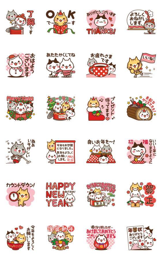 クリスマスや年末年始に使える言葉やポーズがギュッと詰まった、かわいいにゃんこ達の動くスタンプです。 敬語がメインなので誰にでも使いやすい!もちろん毎年使えます!