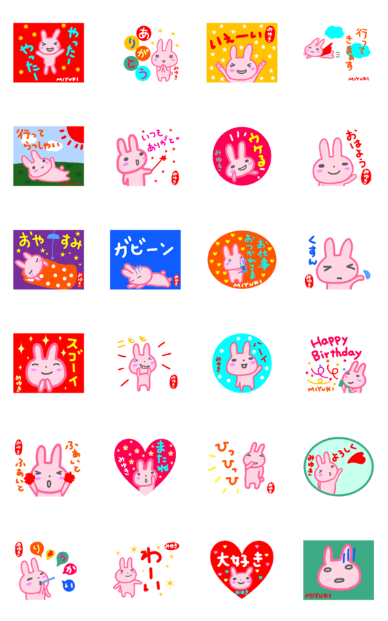 みゆきさん、ちゃん(美由紀、美幸、美雪、美優紀、ミユキ)が使う動く名前スタンプです。 挨拶基本セットです。