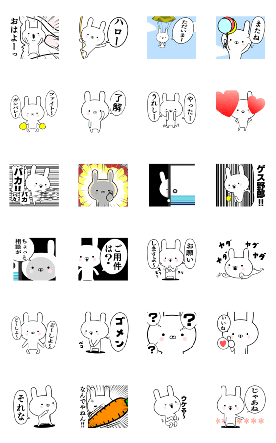 見た目はカワイイウサギです。毎日使えるシンプルなスタンプを詰め込みました。マンガの吹き出しみたいで会話になりやすく、動くので友達や恋人にも伝えやすいっ。